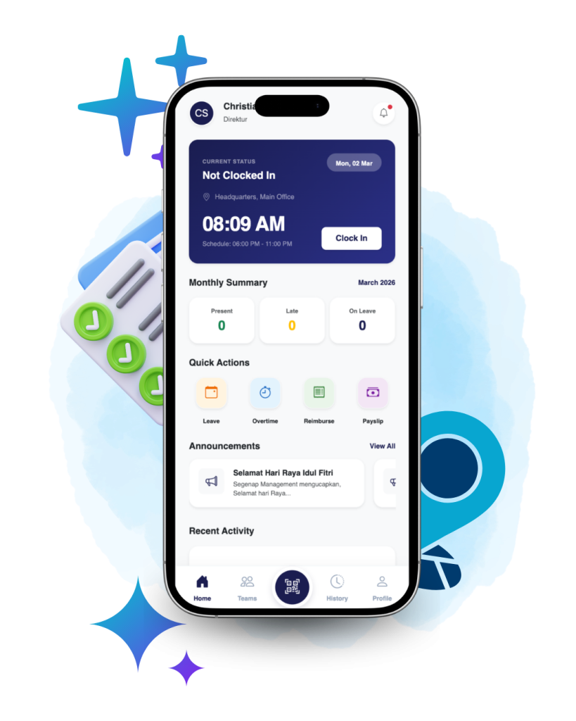 Validasi GPS & Kamera anti-fraud untuk memastikan kehadiran tim secara akurat.