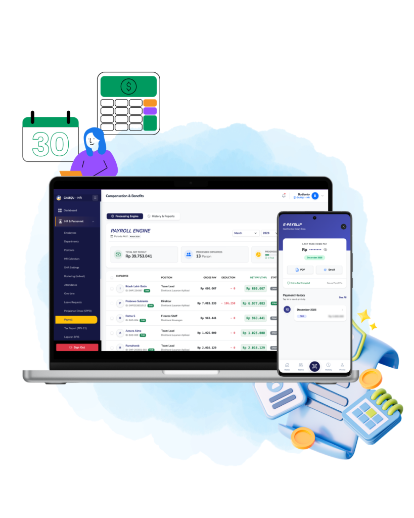 Kalkulasi gaji, pajak (PPh 21), dan BPJS dihitung secara otomatis berdasarkan parameter regulasi yang berlaku di Indonesia.